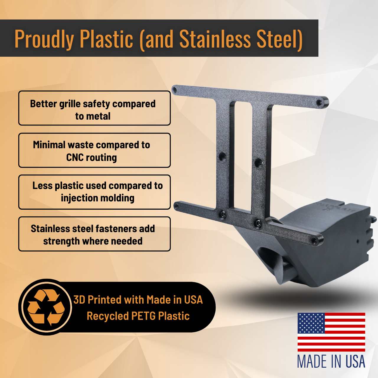 Clean & minimal aesthetic, safety-first repairable design, and 3D-printed Made-in-USA recycled plastic for reduced environmental impact and better grille safety.