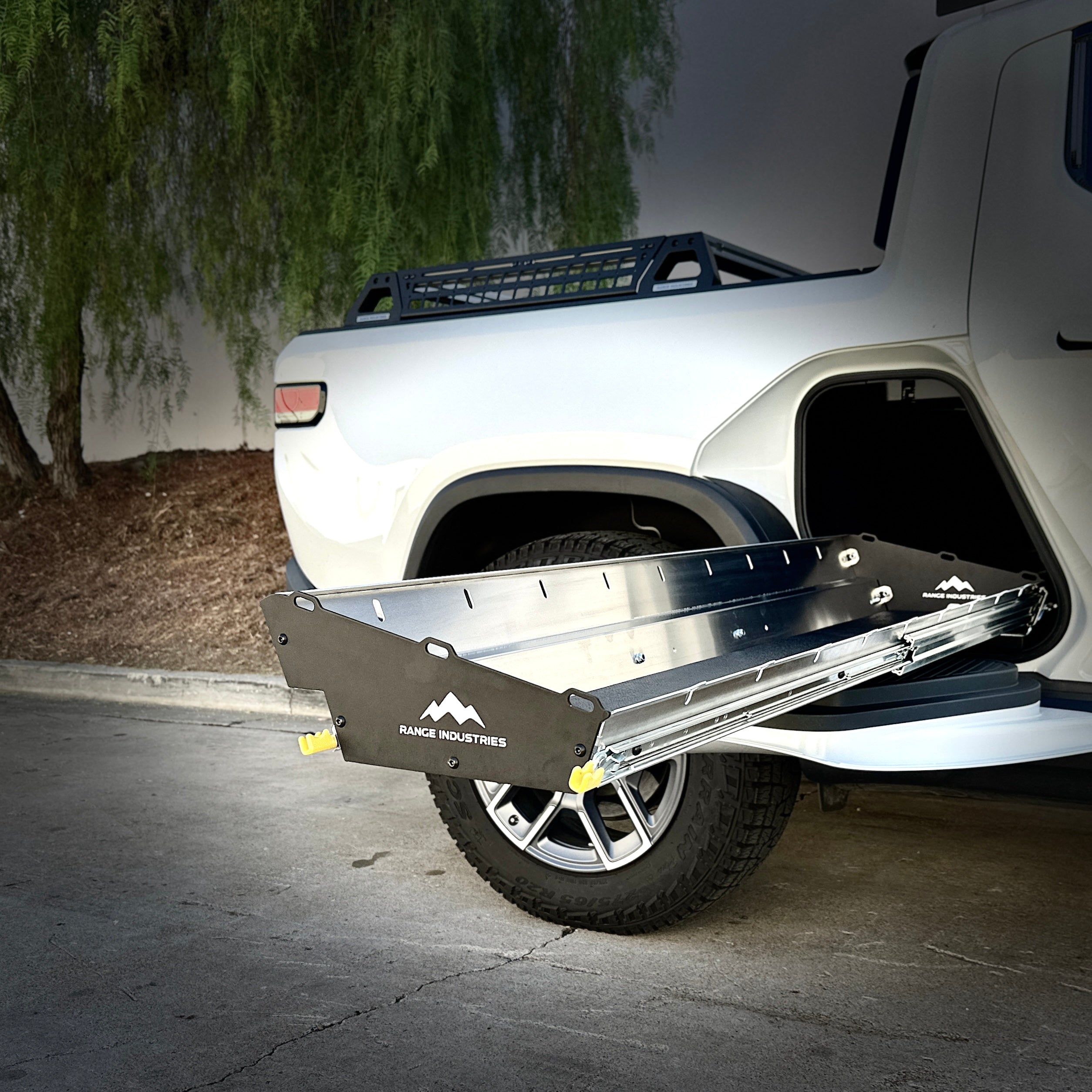 The Rivian R1T Gear Tunnel Slide 'LITE' is our cost-effective answer for those looking to start using their gear tunnel efficiently and conveniently, without the need to carry heavier items (like a camp kitchen). The Range Industries Gear Tunnel Slide 'Lite' pulls out a full 60” to allow access to all your stuff. It is built with heavy-duty parts and can hold up to 100 lbs (evenly dispersed). It locks open and closed and is sturdy and stable at full extension.