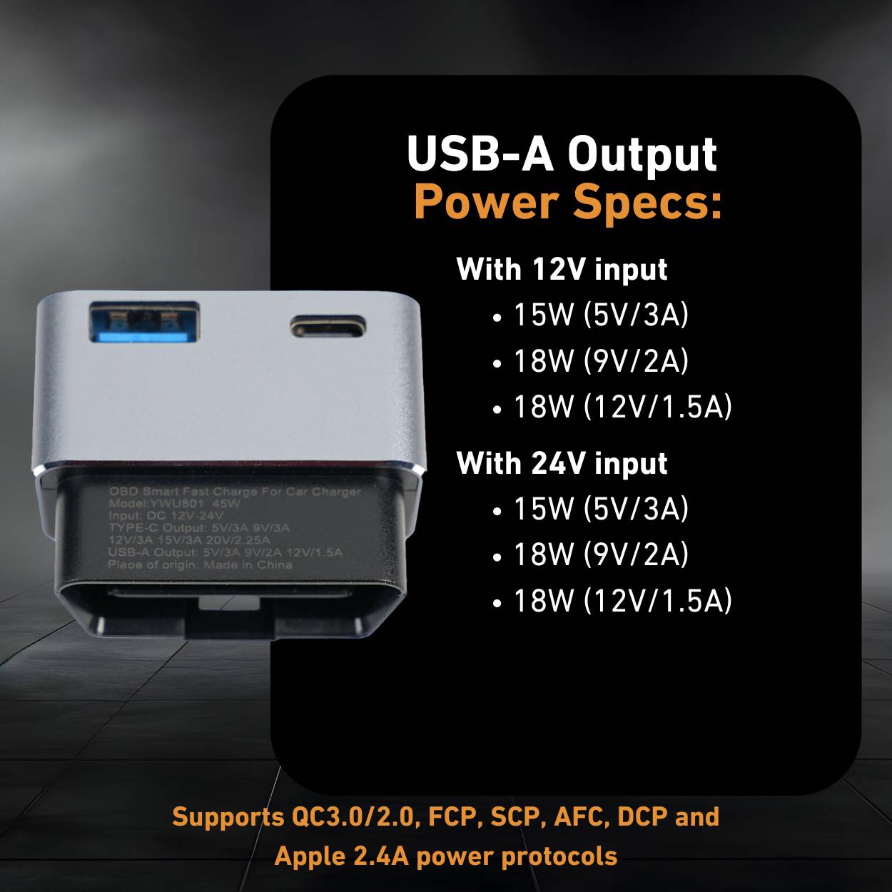 • Powers USB-A devices at up to 18W (12V/1.5W) from 12V-24V OBD2 ports