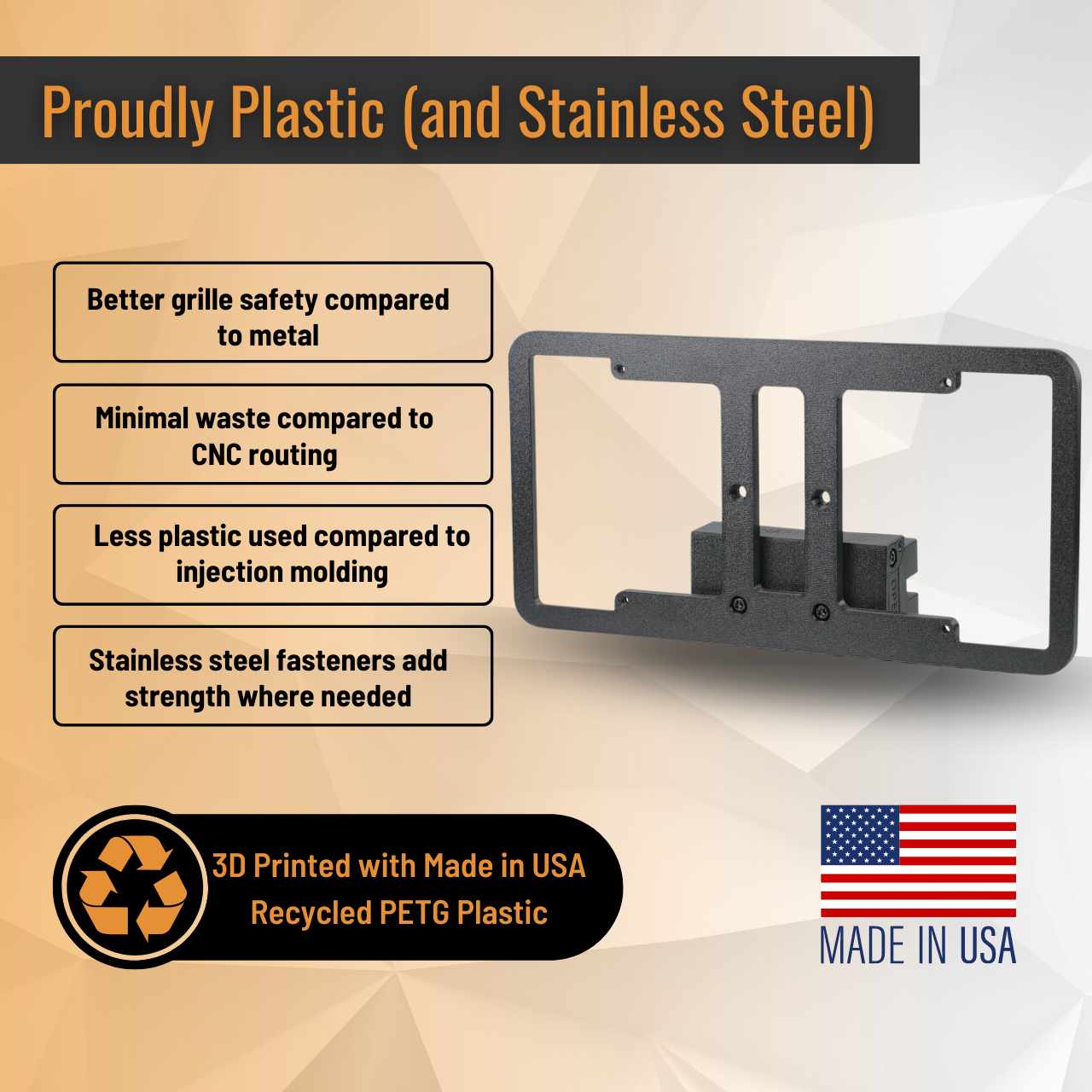 Clean & minimal aesthetic, safety-first repairable design, and 3D-printed Made-in-USA recycled plastic for reduced environmental impact and better grille safety.