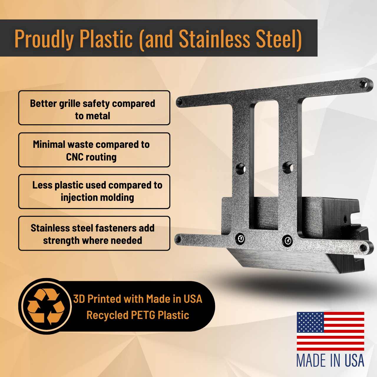 Clean & minimal aesthetic, safety-first repairable design, and 3D-printed Made-in-USA recycled plastic for reduced environmental impact and better grille safety.