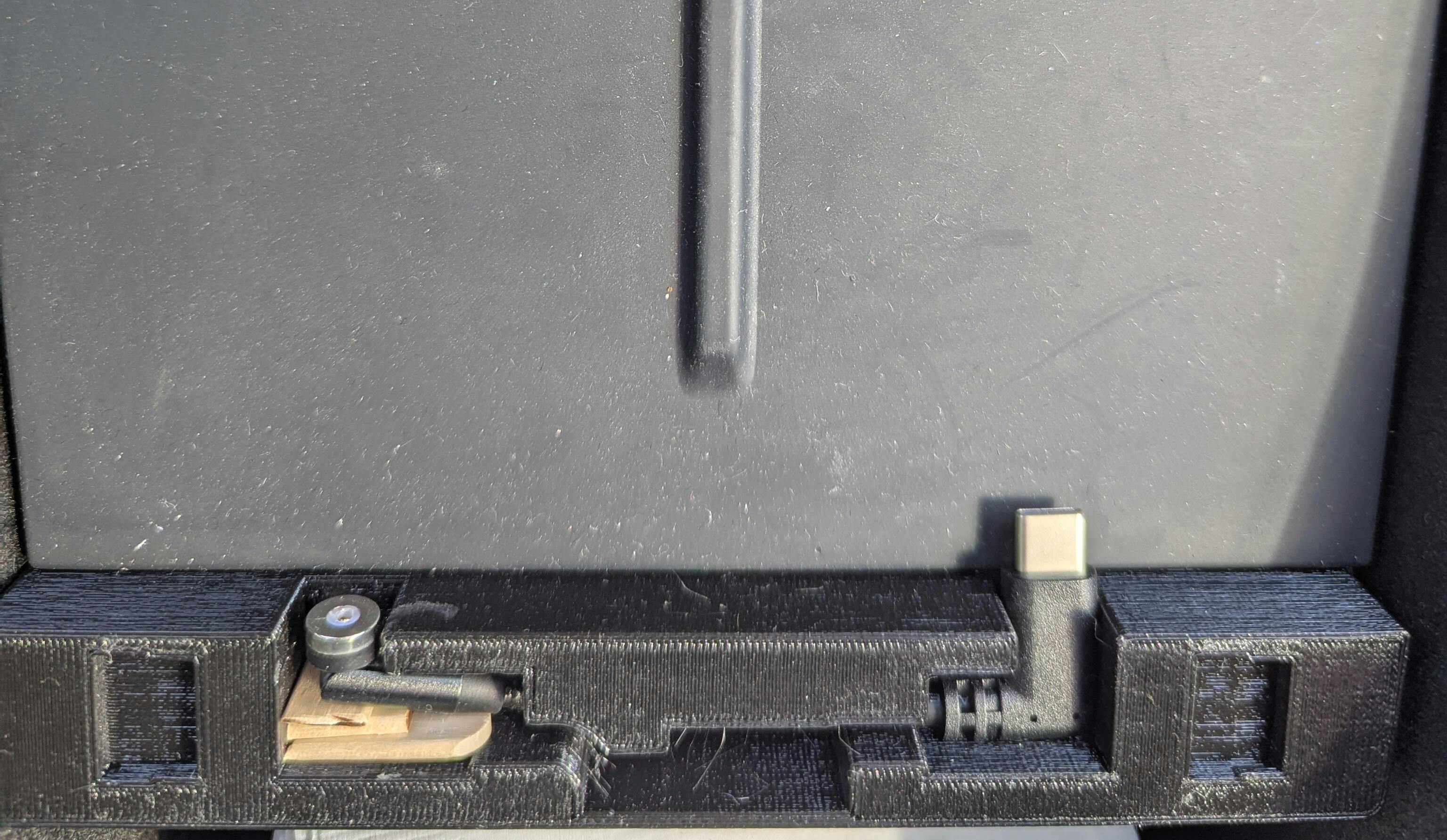 Since the car only has one USB-C port in the console, to power everything, you’ll need to swap cables, run additional power from the 12V outlet in the console, get one of Jeda’s Hubs, or use a USB-C power bank to add more ports.