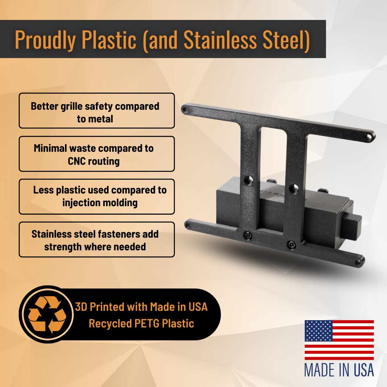 Clean & minimal aesthetic, safety-first, repairable design, and 3D-printed Made-in-USA recycled plastic for reduced environmental impact and better grille safety.
